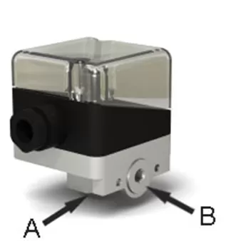 Датчики-реле избыточного давления ДРД подключаются к системе с помощью резьбовых (G1/4) отверстий А и В. При этом, если давление подаётся через отверстие А, отверстие В закрывается заглушкой и наоборот.