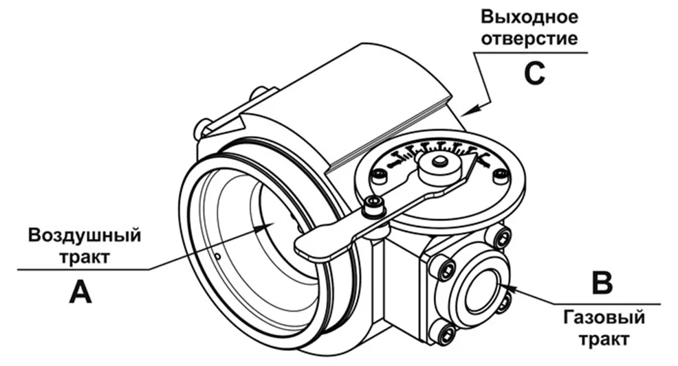 Основными параметрами процесса сгорания топлива являются высокий уровень эффективности и низкий уровень выхлопов. В газовом смесителе происходит смешивание газа и воздуха на основе сопла Вентури. Основанный на давлении всасывания двигателя, воздух поступает в сопло Вентури через воздушнй тракт (впускное отверстие А). В самой узкой области создается вакуум, который затягивает газ через газовый тракт (впускное отверстие В). Происходит смешивание газа и воздуха, готовая смесь выходит через отверстие С. Благодаря различным размерам и диффузорам в форсунке возможно регулирование объема потока смеси.