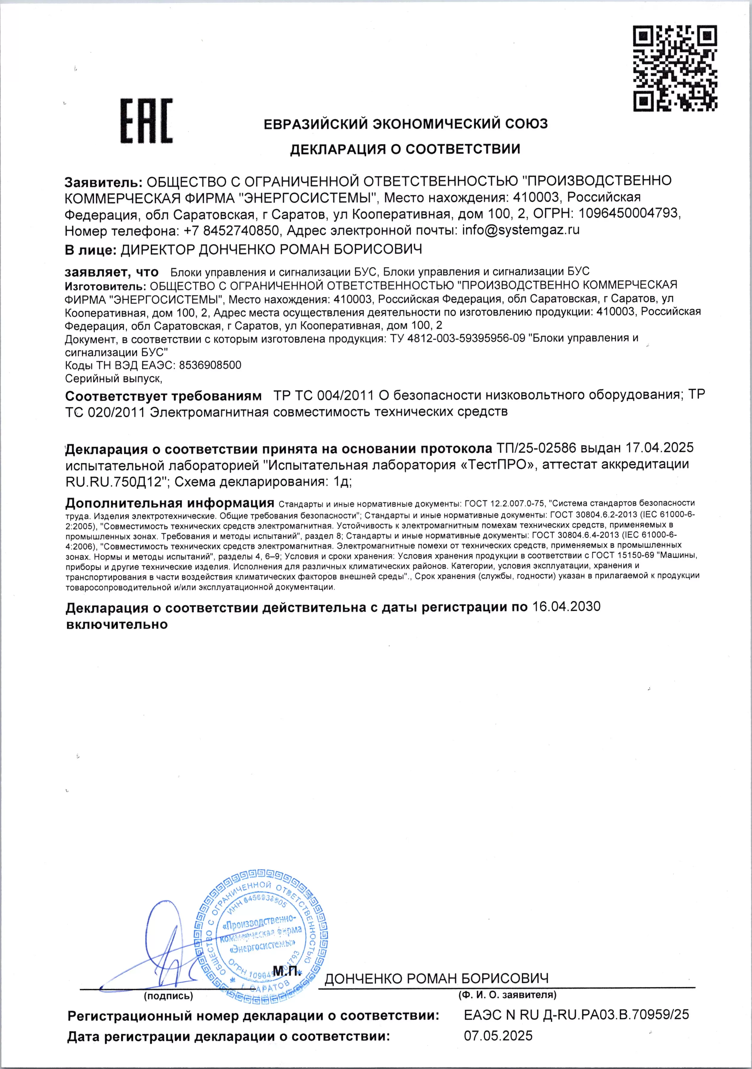 Блок сигнализации и управления БУС-8 имеет два релейных выхода с допустимой нагрузкой: