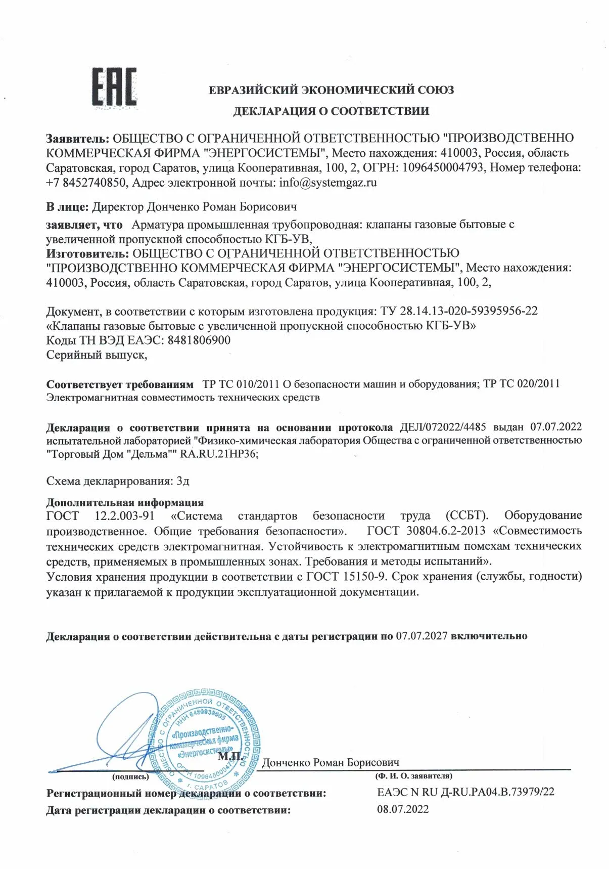 Клапан предназначен для использования в качестве запорного устройства трубопроводных магистралей и газогорелочных установок с рабочей средой в виде: природный газ по ГОСТ 5542-2014, паровая фаза (СУГ) по ГОСТ Р 52087-2018 или воздух с давлением до 0,005 МПа. Клапан может применяется в системе контроля загазованности СКЗ «Кристалл-мини» различных модификаций, а так же может работать как автономное запорное устройство.