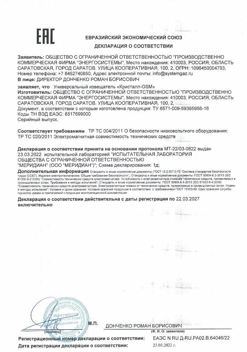 Универсальный извещатель «Кристалл-GSM» предназначен для передачи информации о состоянии подключенных к нему устройств посредством SMS-сообщений, либо голосового оповещения «Система Кристалл, Тревога!» при помощи встроенного GSM-модуля. Изделие может работать в составах систем контроля загазованности «Кристалл-1» и «Кристалл-2», а также с устройствами совместимыми по входным/выходным сигналам.