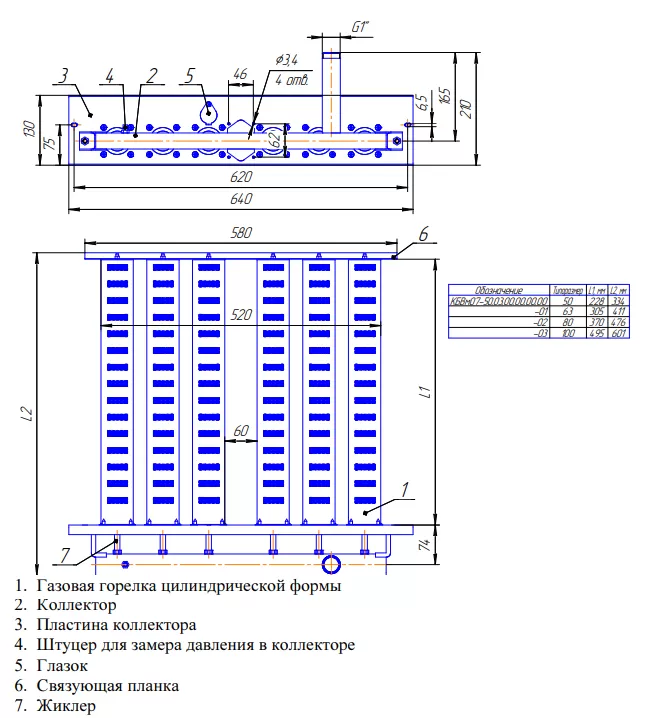 Стальная инжекционная горелка для напольного газового котла «Хопер» мощностью 63 кВт. Поставляется с жиклером и инжекторами для работы на природном газе.