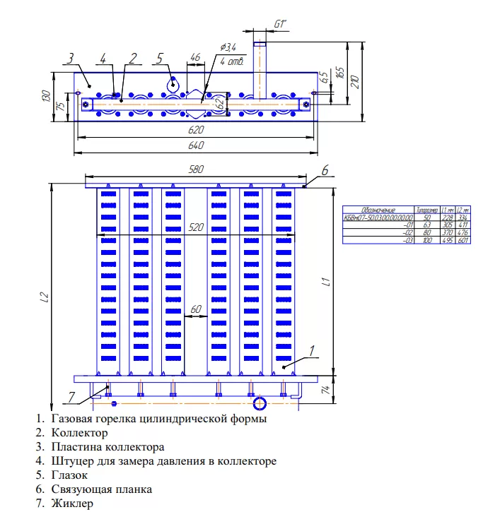 Стальная инжекционная горелка для напольного газового котла «Хопер» мощностью 50 кВт. Поставляется с жиклером и инжекторами для работы на природном газе.