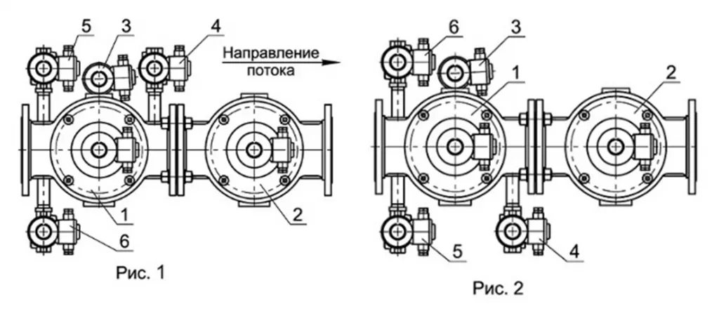 Клапан свечи безопасности и продувочный клапан могут располагаться слева по ходу газа (рис. 1) или справа (рис. 2).